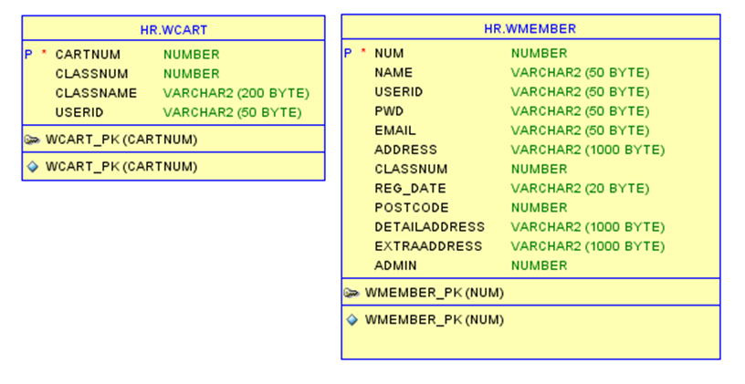 - (WMember의 classnum, WCart의 classnum또한 WClass의 classnum을 참조해야하는데 제약조건 설정을 빼먹었다..)