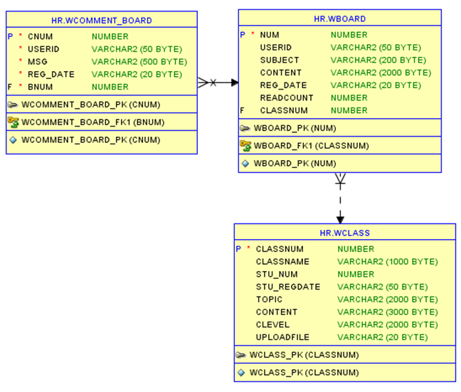 - WClass의 기본키인 classnum(강의번호. 시퀀스로 부여)은 WBoard의 외래키로 참조된다.
