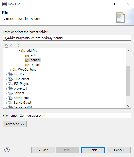org.addrMy.config 패키지를 생성하고 Configuration.xml 만들기 (New File)