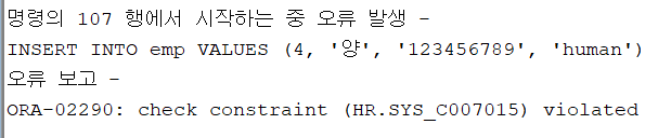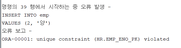 제약조건의 이름이 없지만 PRIMARY KEY 명령어에 의해 eno 컬럼은 기본키가 되고, 중복값이 오거나 NULL 값이면 안되기 때문에 오류가 발생