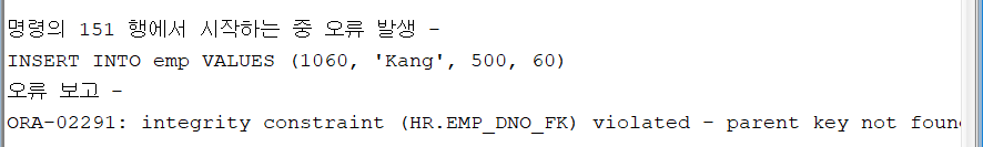 emp에서 참조하고 있는 dept 테이블의 dno은 현재 dno가 10, 20, 30, 40, 50. 60이 없기에 입력 불가능