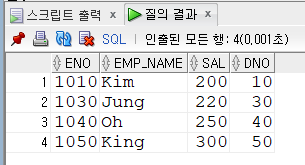 INSERT INTO emp VALUES (1030, 'Jung', 220, 30);