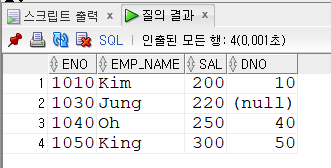 INSERT INTO emp VALUES (1060, 'Kang', 500, NULL);