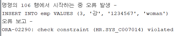 INSERT INTO emp VALUES (3, '강', '1234567', 'woman');