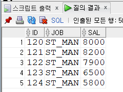 employees 테이블의 job_id가 'ST_MAN'인 직원들을 새 테이블 stmans를 만들어 입력. 단 테이블의 컬럼 이름은 id, job, sal (직원 테이블의 employee_id, job_id, salary)