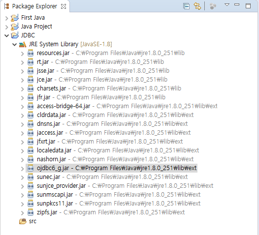 오라클 JDBC 드라이버를 다운로드 후 C:\Program Files\Java\jre1.8.0.251\jre\lib\ext에 옮겨놓음