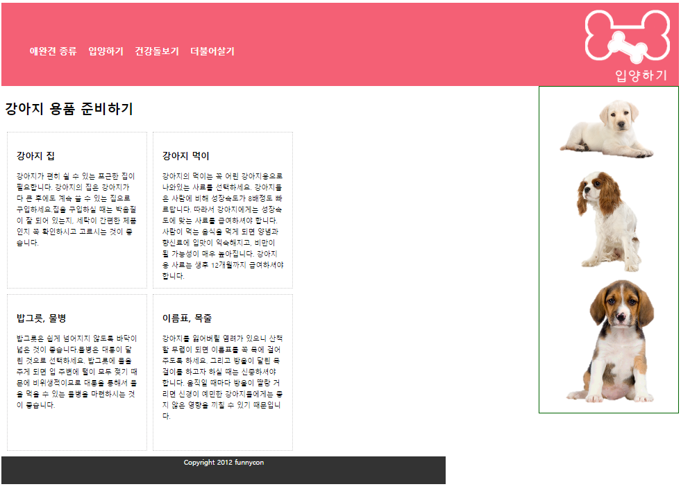 <p>강아지가 편히 쉴 수 있는 포근한 집이 필요합니다. 강아지의 집은 강아지가 다 큰 후에도 계속 쓸 수 있는 집으로 구입하세요.집을 구입하실 때는 박음질이 잘 되어 있는지, 세탁이 간편한 제품인지 꼭 확인하시고 고르시는 것이 좋습니다.</p>
