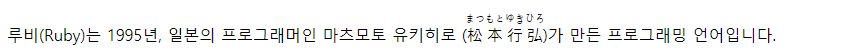 <p>루비(Ruby)는 1995년, 일본의 프로그래머인 마츠모토 유키히로 (<ruby>松本行弘<rt>まつもとゆきひろ</rt></ruby>)가 만든 프로그래밍 언어입니다.</p>