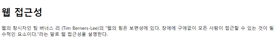 <p>웹의 창시자인 팀 버너스 리 (Tim Berners-Lee)의 <q cite="http://www.w3.org/standards/webdesign/accessibility">웹의 힘은 보편성에 있다. 장애에 구애없이 모든 사람이 접근할 수 있는 것이 필수적인 요소이다.</q>라는 말로 웹 접근성을 설명한다. </p>