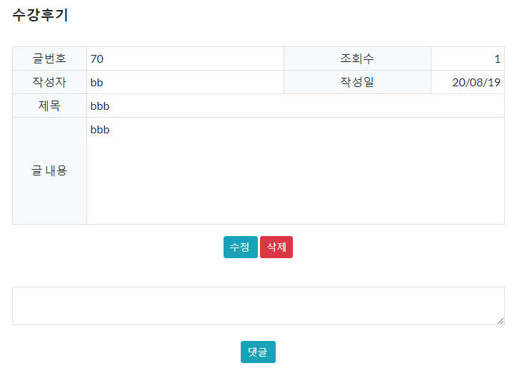 오늘 포스팅할 내용은 수강후기 게시판에서 제목을 눌렀을 때 보이는 수강후기 글 상세보기 및 수정, 삭제와 그 밑에 달리는 댓글 입력하고 삭제하는 기능 구현이다.