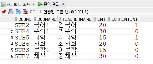 그러나 과목코드, 강의명, 교사명, 정원은 subject 테이블에 있고, 현재 수강인원은 select count(*)를 해서 attend 테이블에서 가져와야한다.