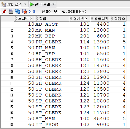 employees 테이블에서 부서별, 직업별(job_id), 상사번호(manager_id)별로 그룹을 지어 salary 합계와 그룹별 직원의 숫자를 출력