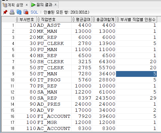 employees 테이블에서 department_id별, job_id별 salary의 평균을 평균급여 이름으로, salary의 합계를 총급여합계로, department_id를 부서번호로, 부서인원수를 부서별 직업별 인원수로 출력