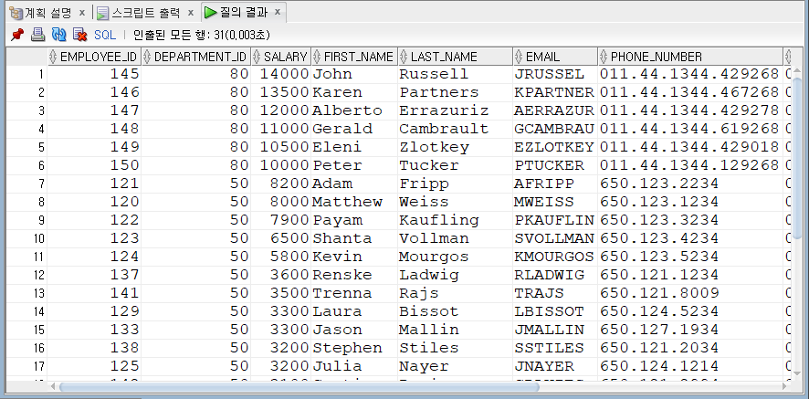 employees 테이블에서 부서별 사원수, 최대급여, 최소급여, 급여합계, 평균급여를 급여합계 큰순으로 출력